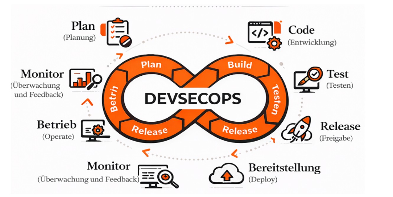 Der DevSecOps-Zyklus ist ein kontinuierlicher Prozess, der alle Phasen von der Planung bis zum Betrieb umfasst (die Anzahl der Phasen kann abweisen). Er wird häufig in Form einer Endlosschleife (∞) dargestellt, um zu verdeutlichen, dass jede Phase in die nächste übergeht und durch kontinuierliches Feedback sowie automatisierte Sicherheitsprüfungen ergänzt wird.