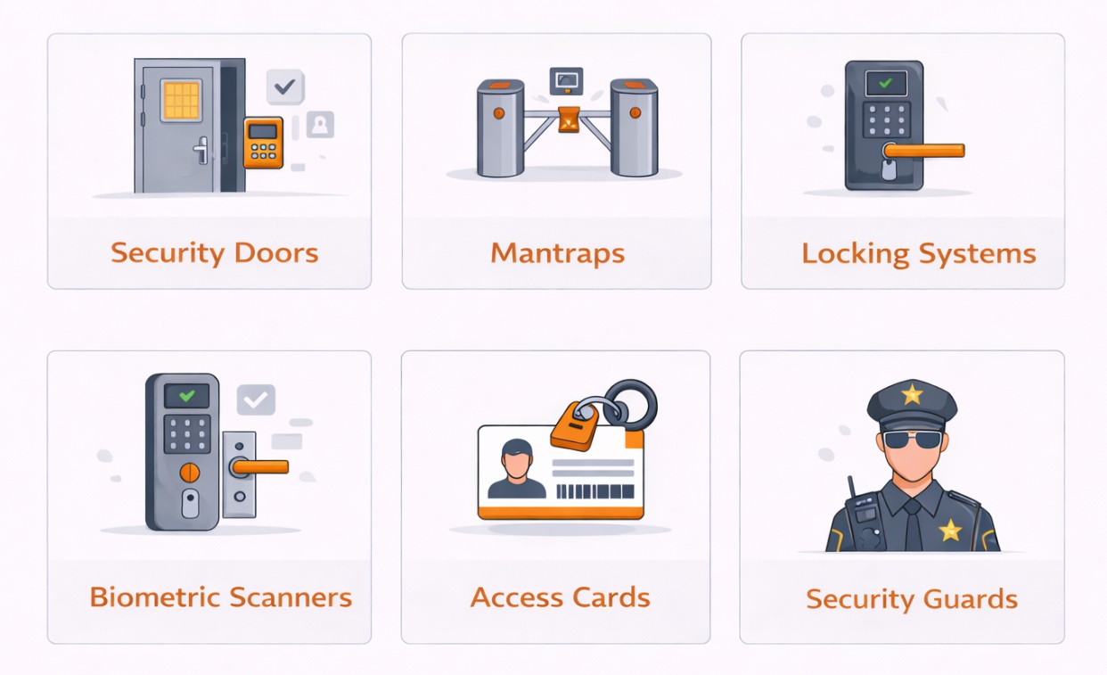 Preventive Controls (präventive Kontrollen) – sollen verhindern, dass ein Sicherheitsvorfall überhaupt eintritt. Dazu zählen physische Zugangsbeschränkungen wie Sicherheitstüren, Zugangsschleusen (Mantraps), Schließsysteme, biometrische Scanner, Zutrittskarten, Sicherheitszäune sowie Wachpersonal.